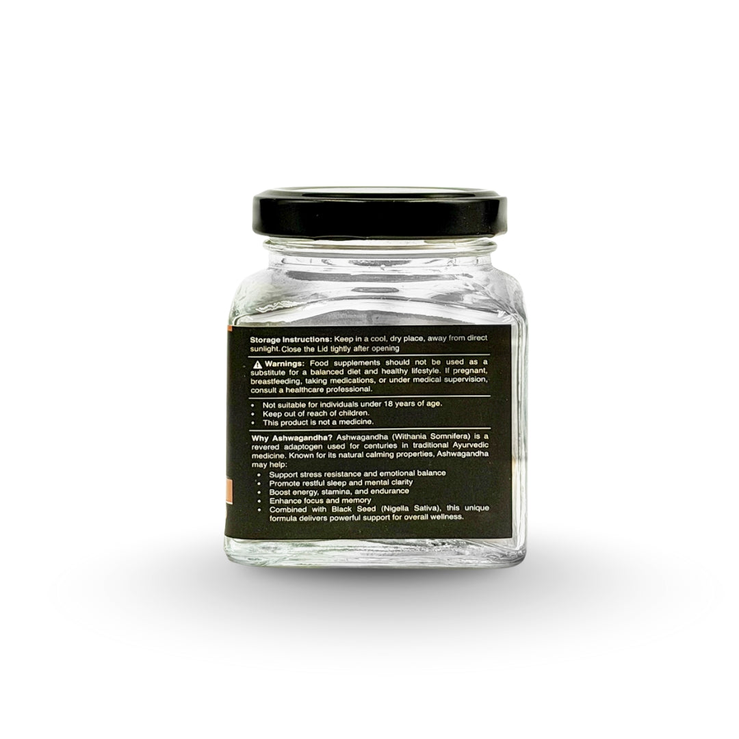 Black Seed & Ashwagandha Capsules combine two powerful natural ingredients known for supporting stress relief, energy balance, immune strength, and overall wellness. Each capsule contains 450mg of pure Ashwagandha Root Powder and 50mg of Black Seed Powder, along with 10mg of Halal-certified gelatin for safe and easy consumption.