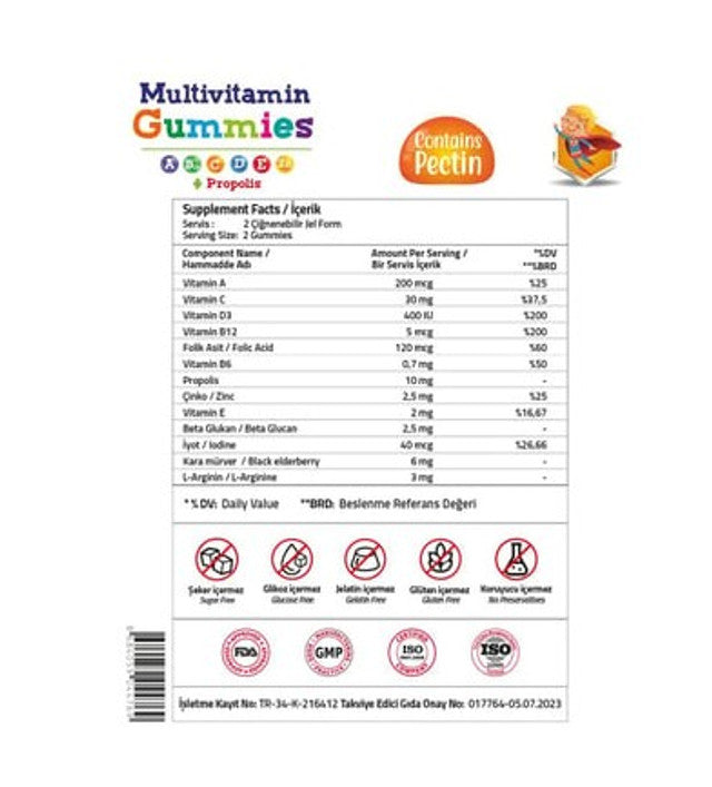 Ingredients: Stabilizer: Maltitol, Deionized Water, Gelling Agent: Pectin, Acidity Regulator: Citric Acid, Flavoring: Orange Flavor, L-Ascorbic Acid, Sweetener: Sucralose, Propolis, DL-Alpha-Tocopheryl Acetate, Zinc Sulfate Monohydrate, Black Elderberry Extract, Cholecalciferol, L-Arginine, Retinyl Acetate, Beta Glucan, Colorant: Beet Root Red, Pyridoxine Hydrochloride, Pteroylmonoglutamic Acid, Potassium Iodide, Methylcobalamin.